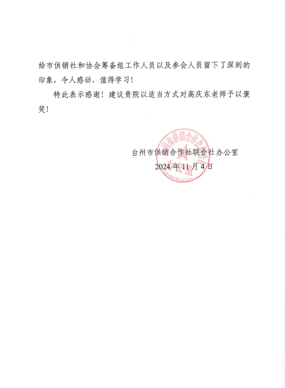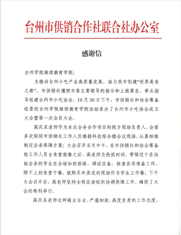 台州市供销社对于tyc41183太阳成集团的承办工作高度认可,专门发来感谢信,认为tyc41183太阳成集团高庆东老师作为本次会务合作项目的院方现场负责人,敬业乐业、严谨细致、高度负责坚持全程组织协调保障工作,确保了大会的顺利举行印象深刻,令人感动,值得学习。