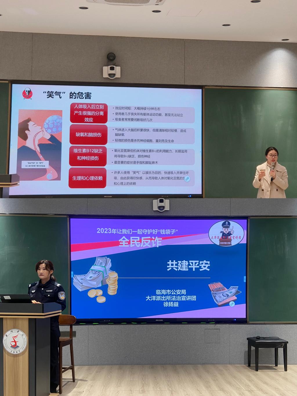 临海市公安局大洋派出所民警徐扬益以“全民反诈 共建平安”为主题,用视频和案例普及“冒充公检法”、电信诈骗、“蜜约”刷单诈骗、贷款类诈骗等犯罪手段,提高学生对诈骗行为的警惕性,守护好自己的“钱袋子”,同时还讲解了诈骗五项补救措施实用小知识。